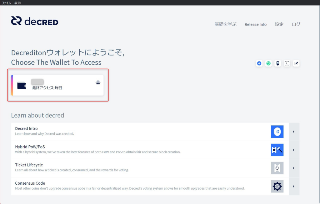※2回目以降の起動時は、設定したウォレット名が書かれているアイコン(赤い四角の部分)をクリックしてください。