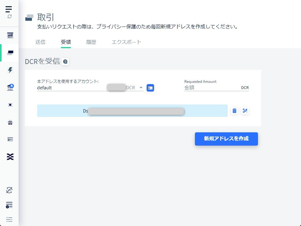 本アドレスを使用するアカウント: DCRを受け取りたいアカウントを指定します。