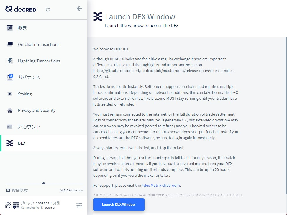 DCRDEX機能が使えます。基本的な操作はBison Walletと同じです。